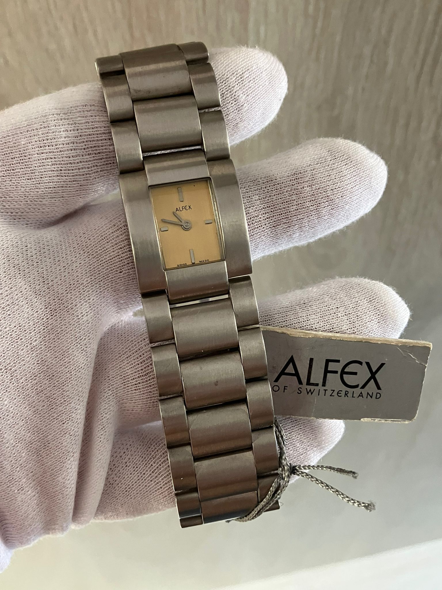 Reloj de mujer marca Alfex suizo. Esfera color tipo bronce, armis contundente con cierre de seguridad. Mide 23 x 29,30 mm sin contar corona. Pila nueva, funciona correctamente. Oportunidad por precio, marcaba 300 euros.