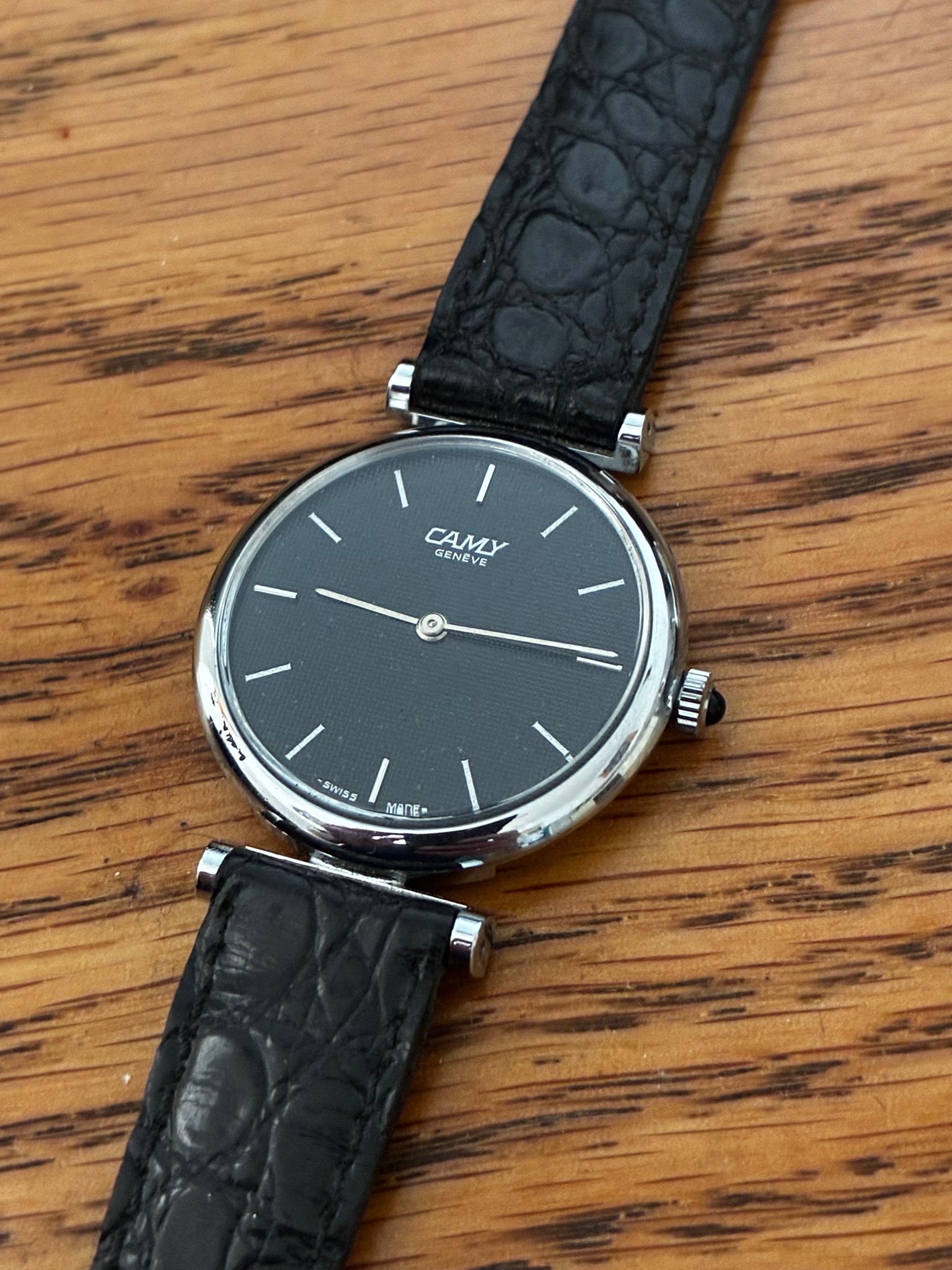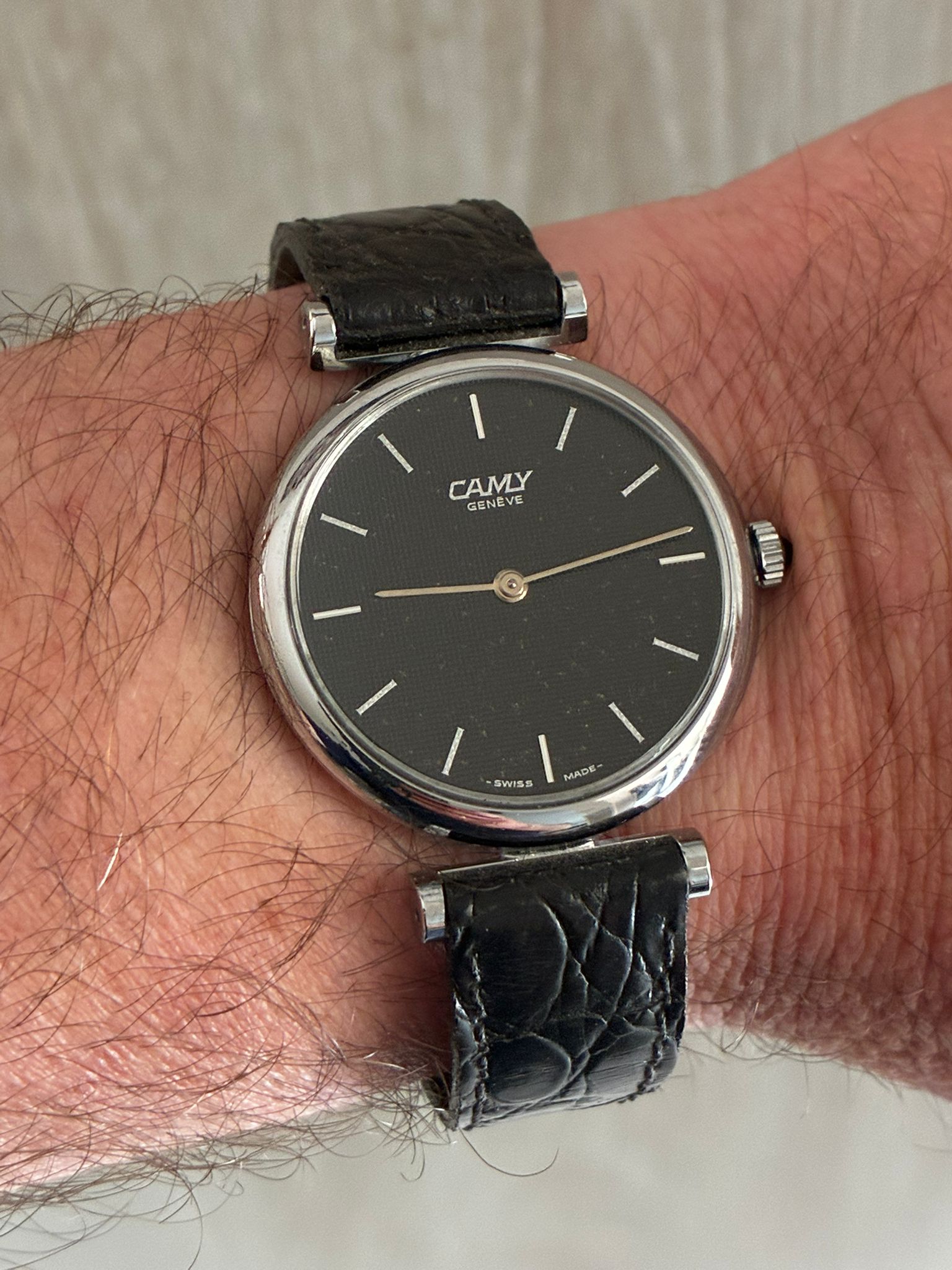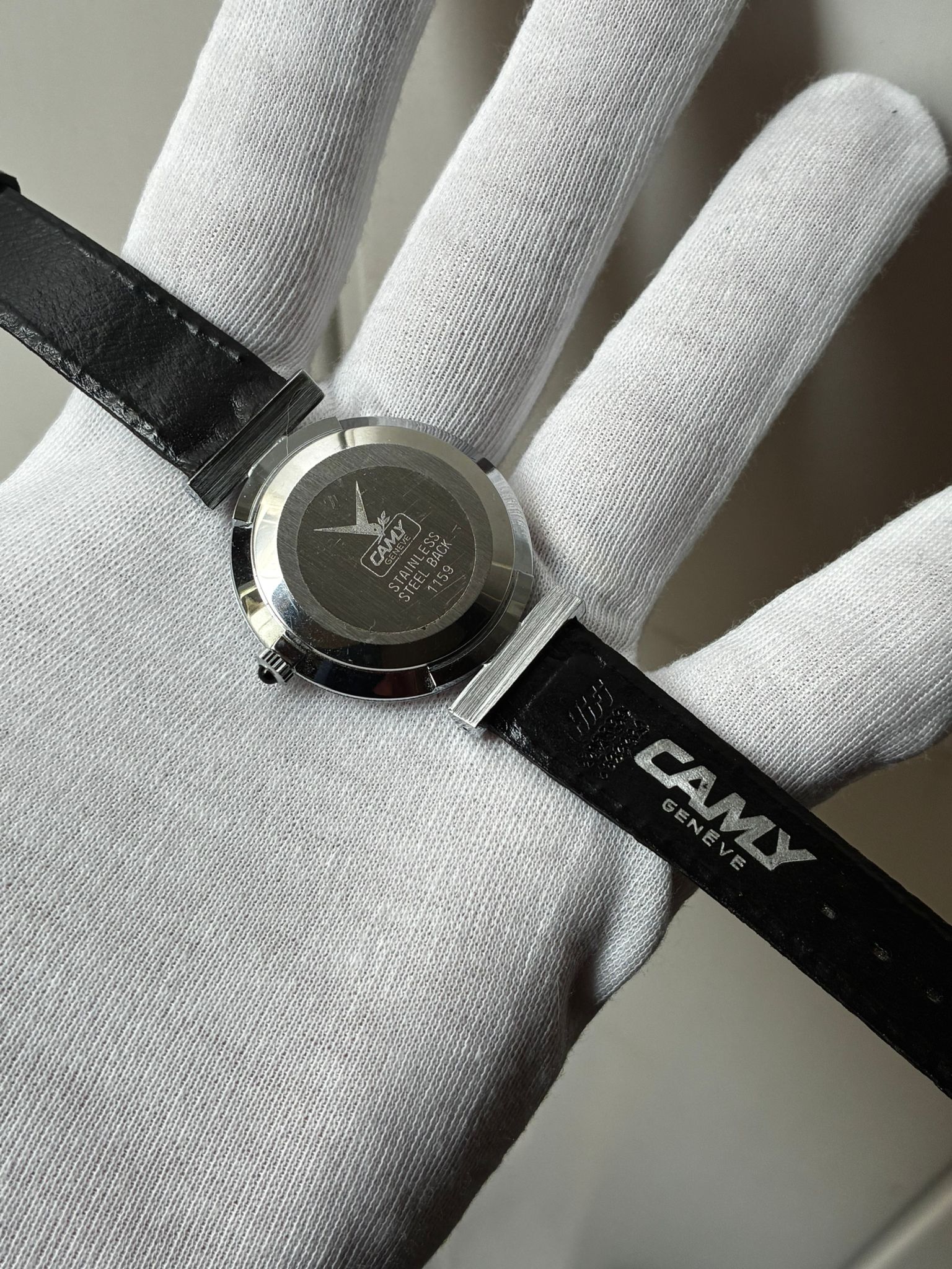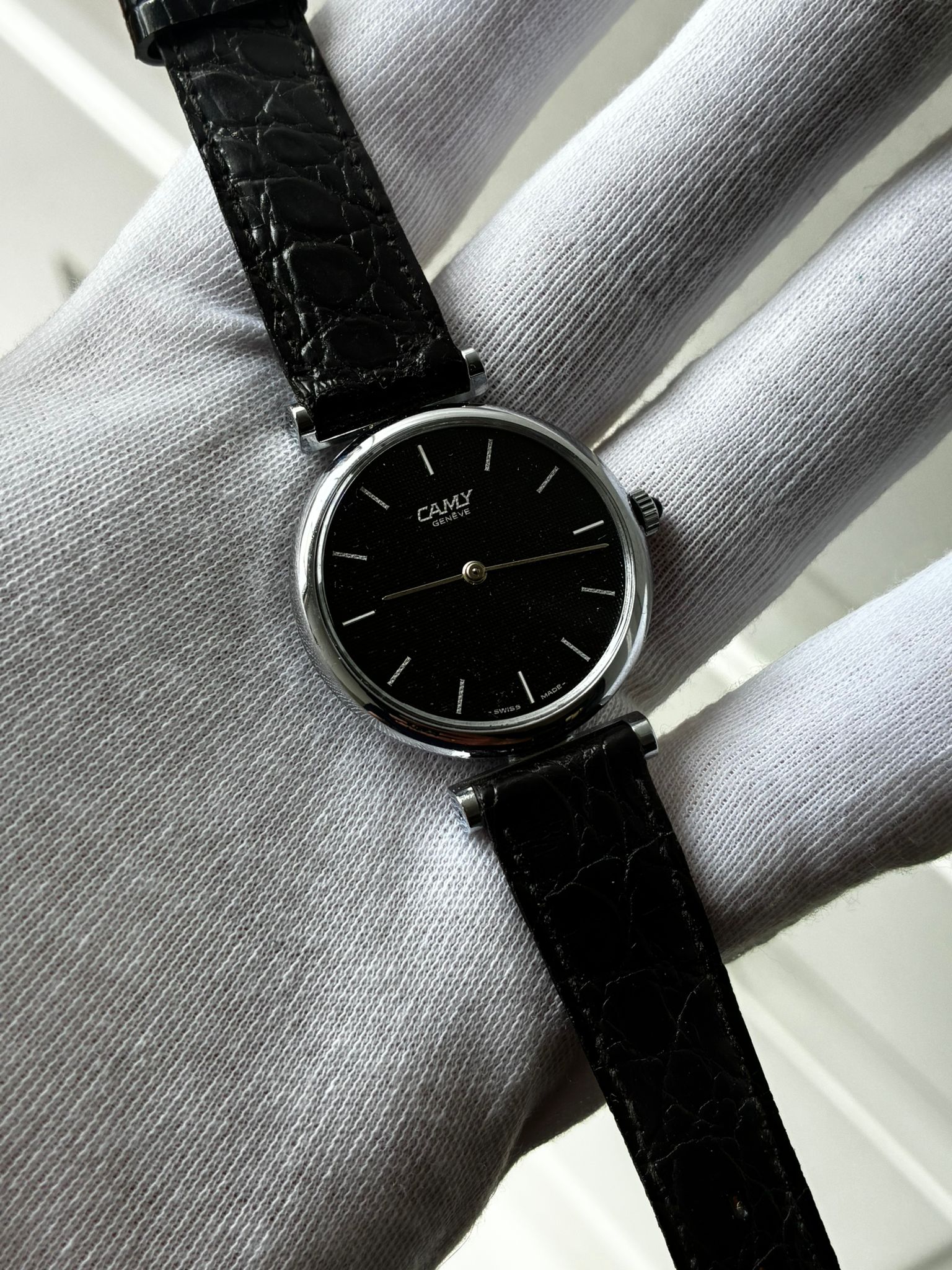 Reloj camy de cuerda años 70 NOS de antiguo stock de relojería sin uso , esfera negra , correa firmada , plexiglas a estrenar, mide 33 mm sin contar Corona, funciona correctamente, muy elegante