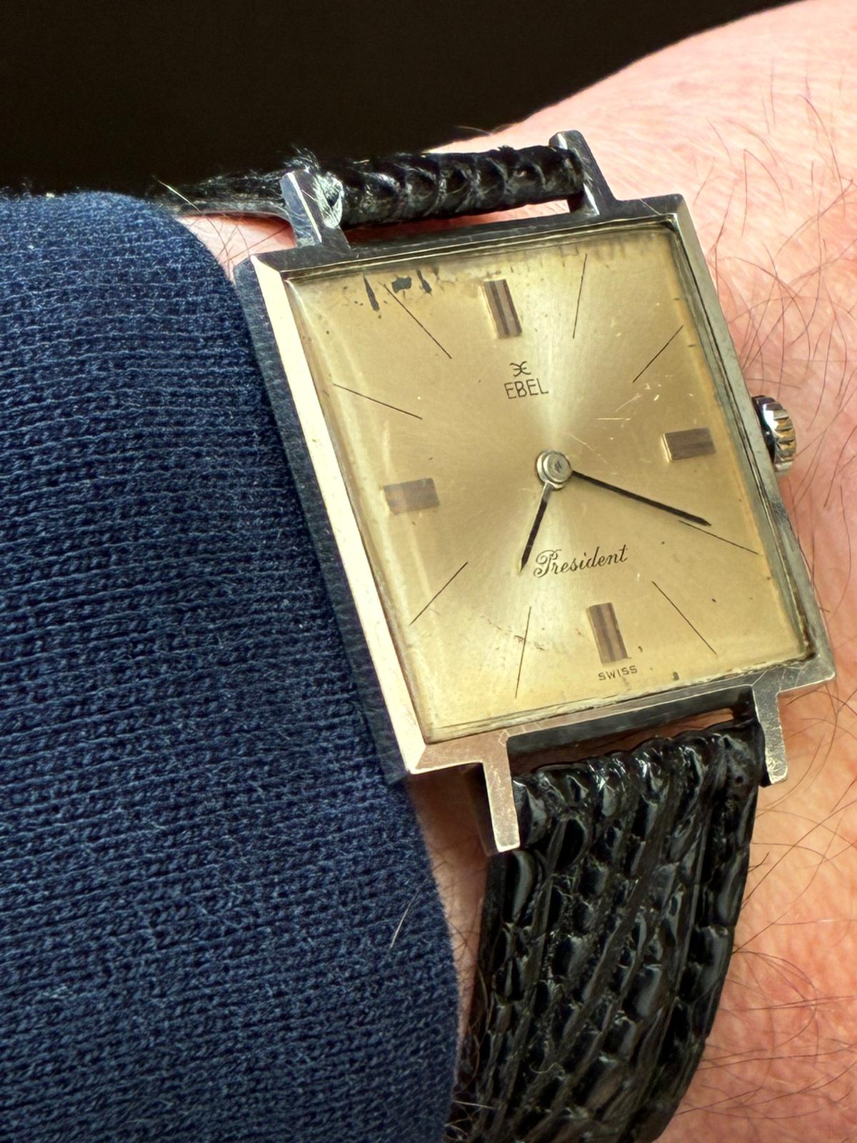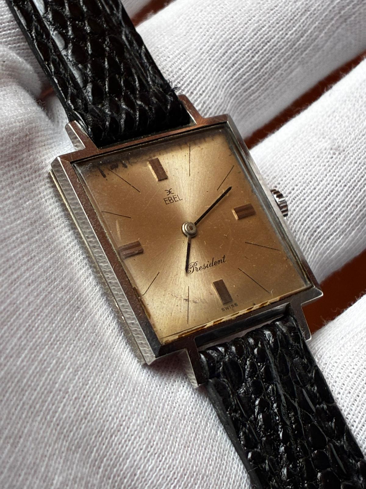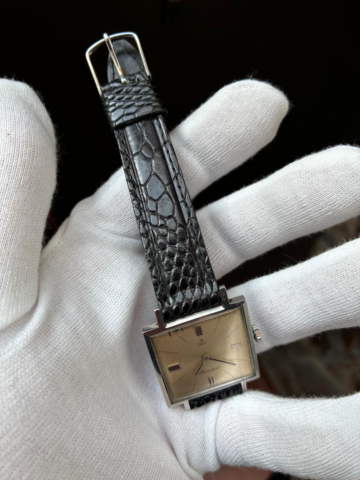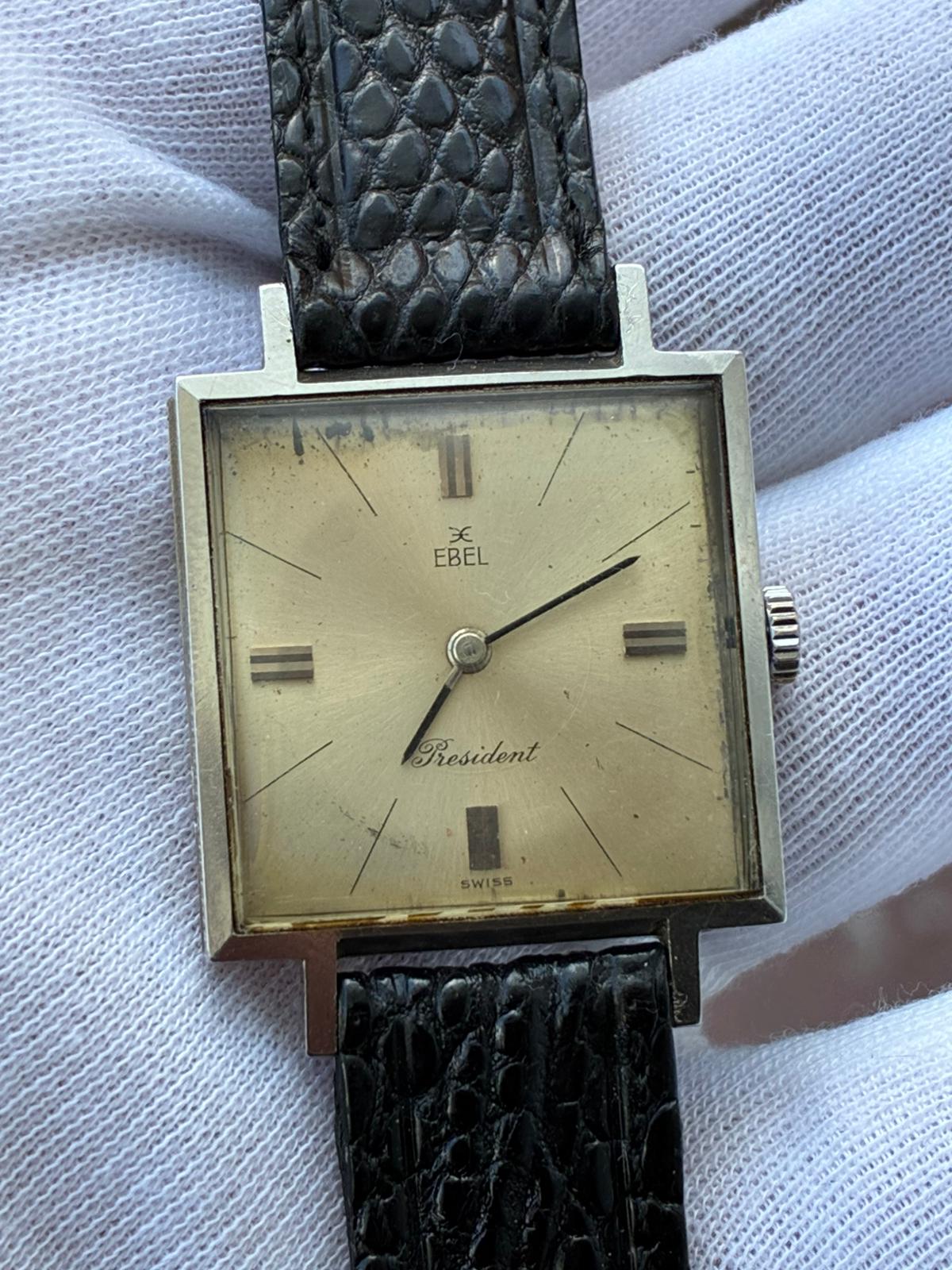 Reloj suizo de la prestigiosa casa suiza EBEL de cuerda modelo president , monta calibre manufactura propia ref 97, recién revisado de mecanismo por maestro relojero, funcionando correctamente, correa a estrenar de piel de lagarto color negro , medida de la caja 28×37 mm, pieza vista en venta en aplicaciónes por más de 800 euros oportunidad