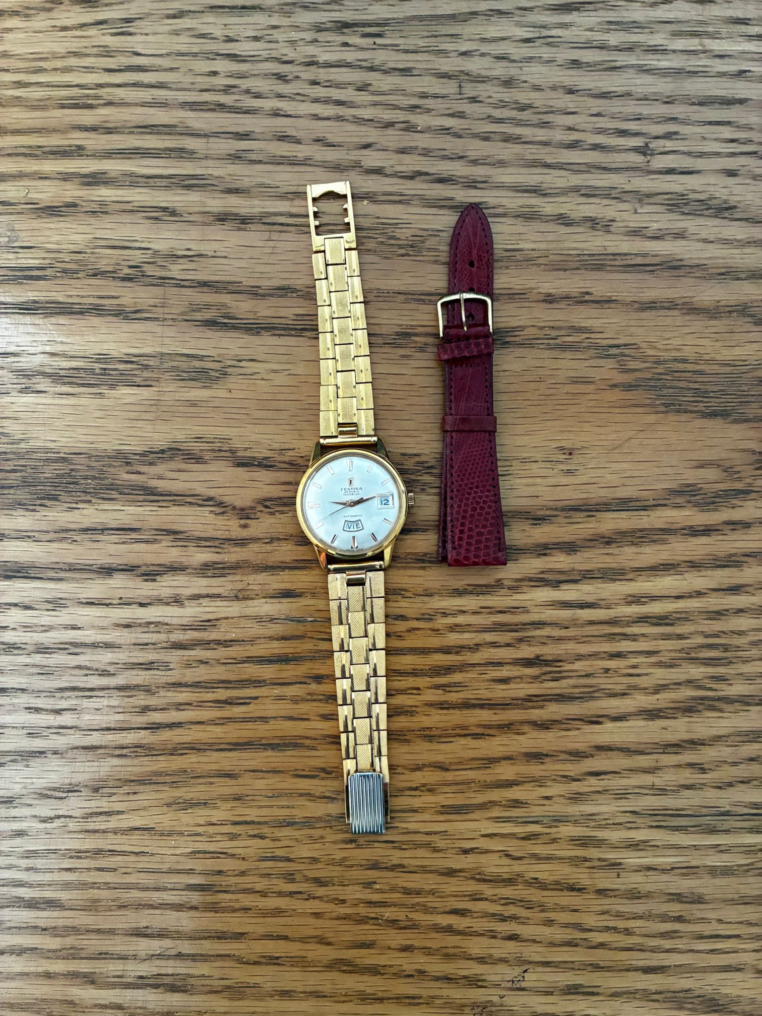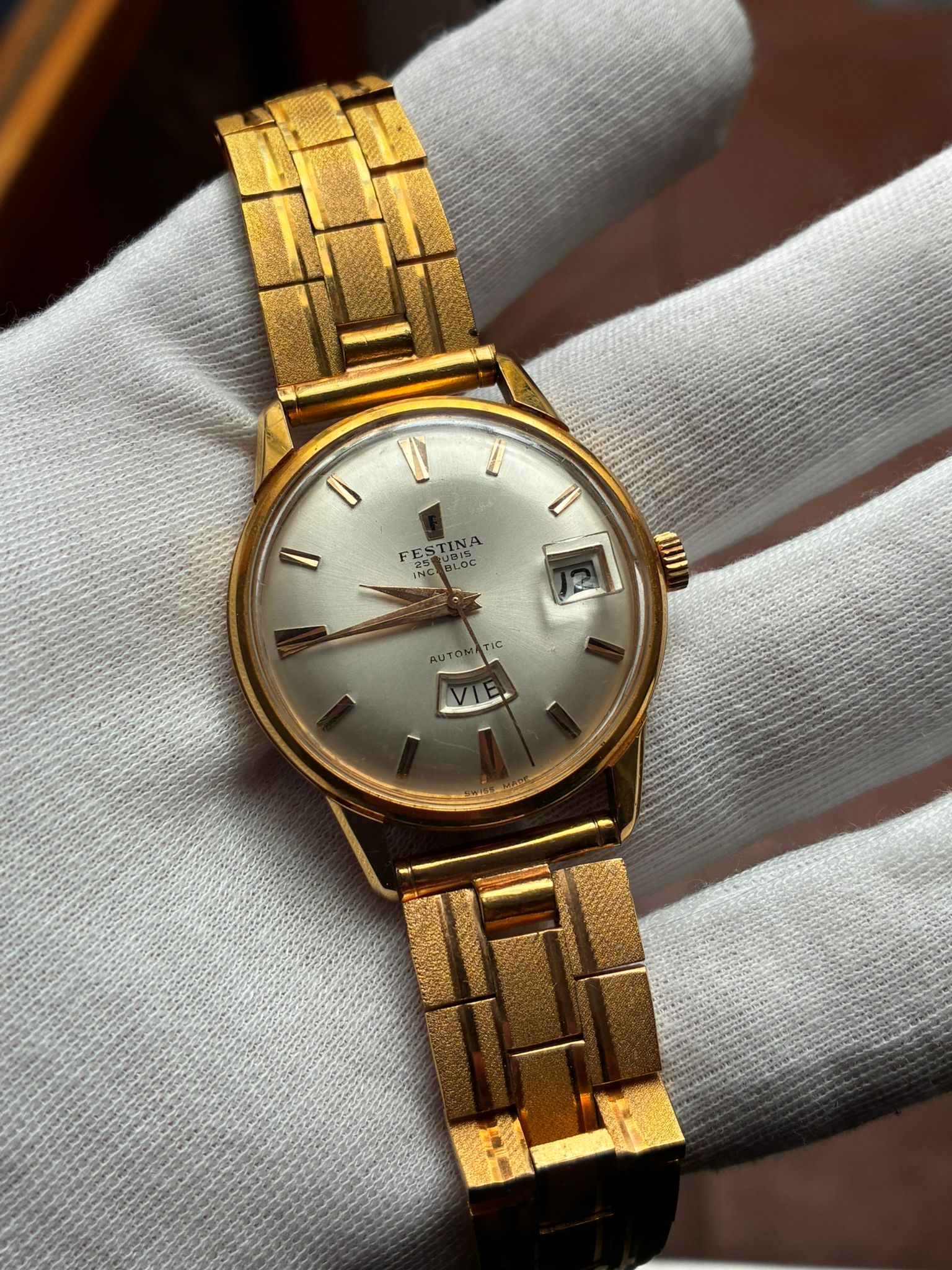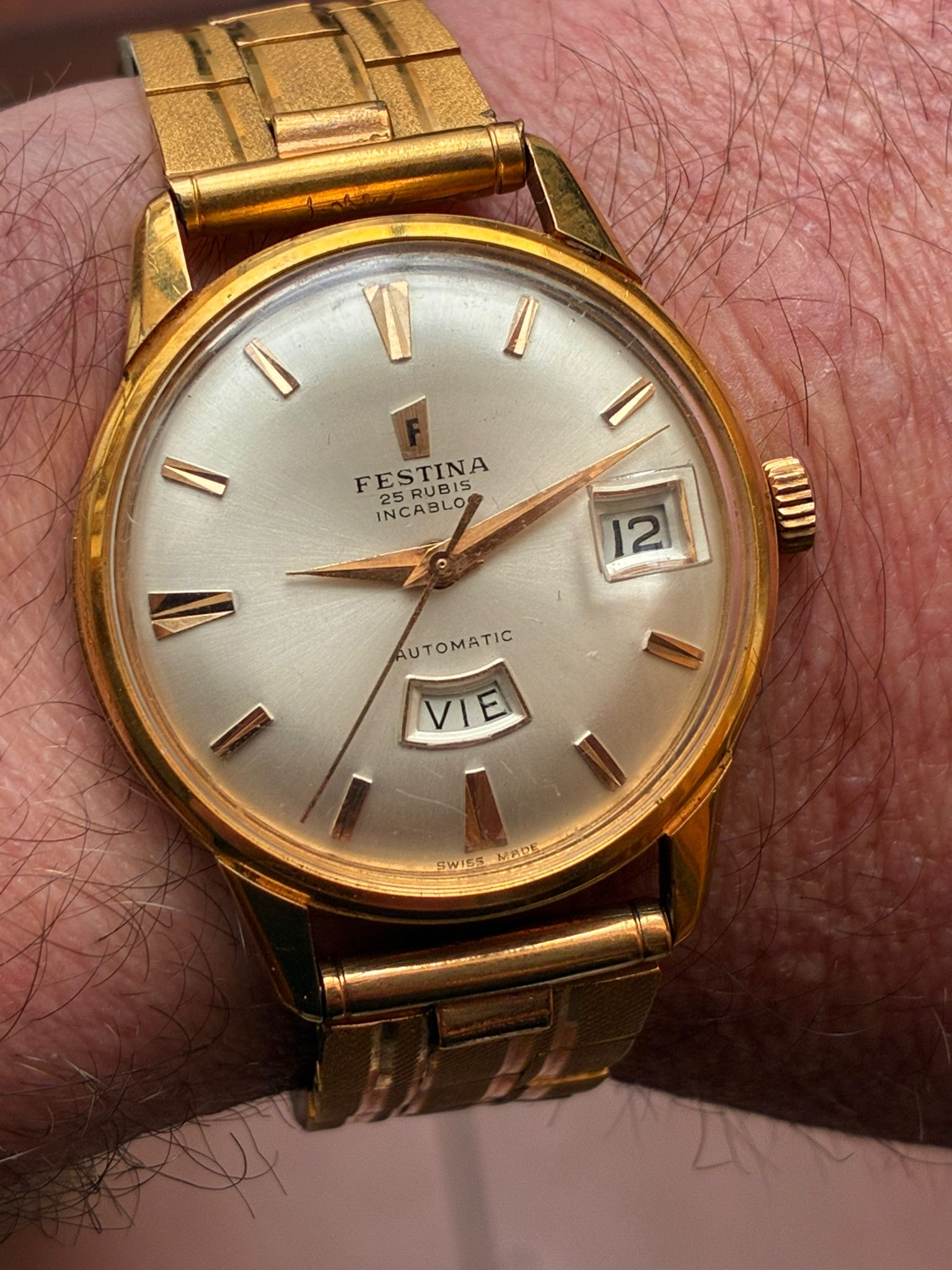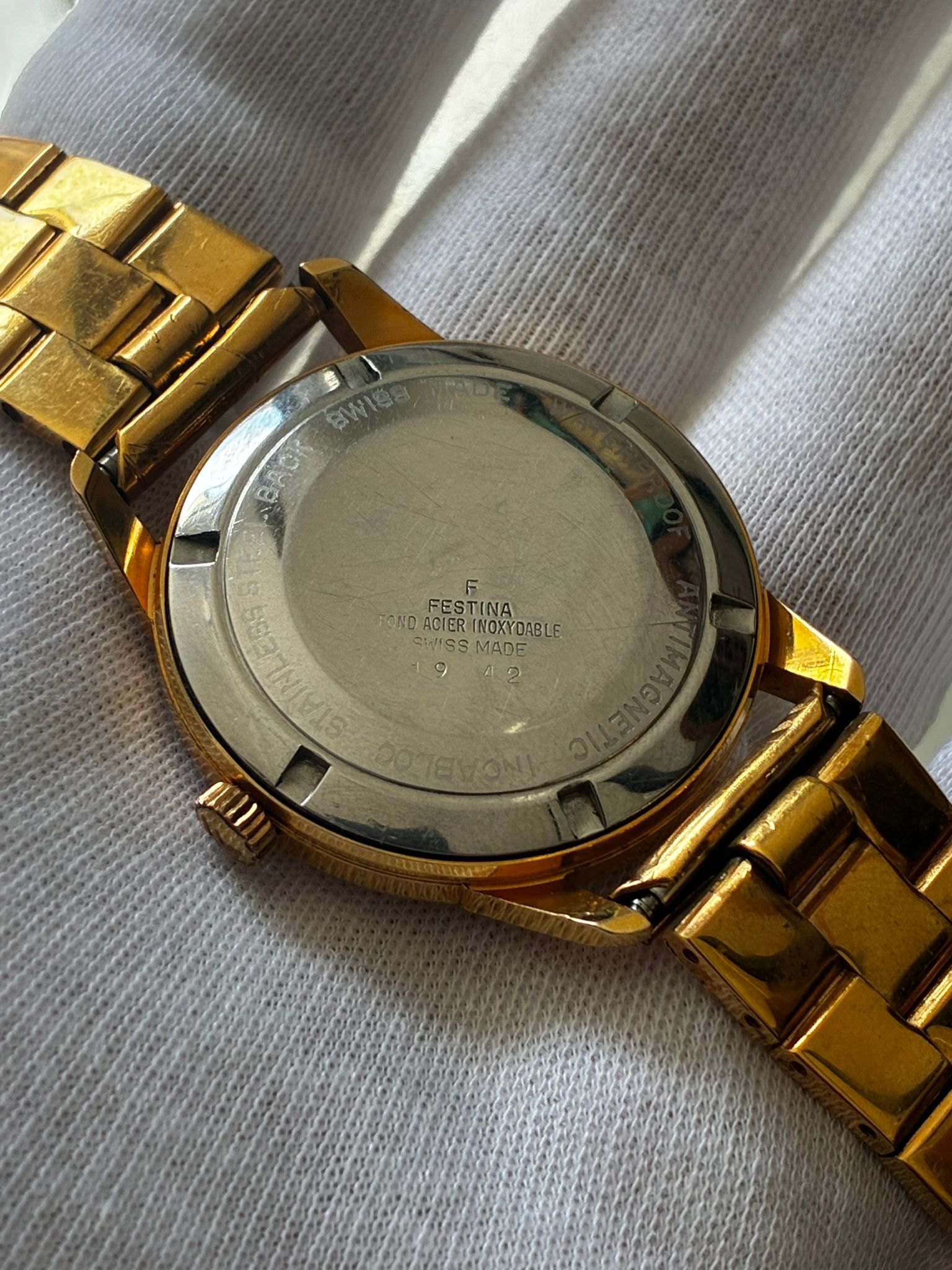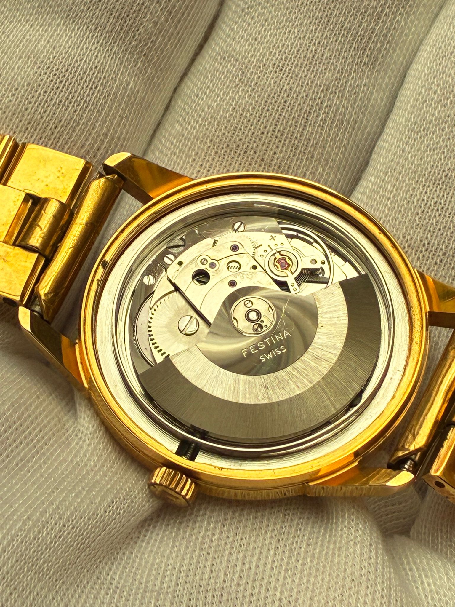 Reloj automático festina doble calendario con calibre automático ETA 1767, caja baño de oro , recién revisado de mecanismo por maestro relojero funcionando correctamente, se entrega con Armis Baño de oro más correa a estrenar de piel de lagarto color vino, plexiglas a estrenar , súper cuidado , modelo raro de ver oportunidad por estado y model