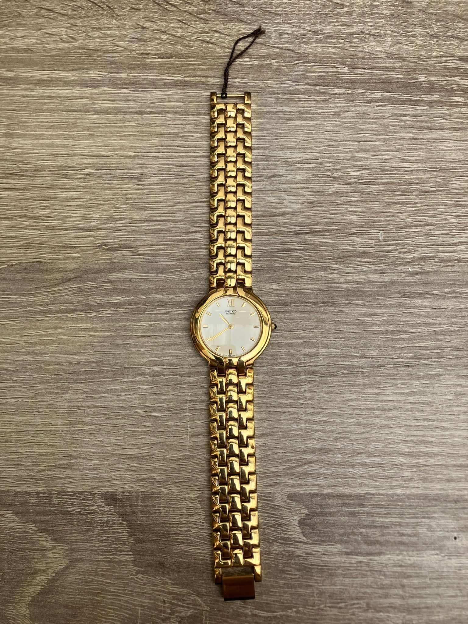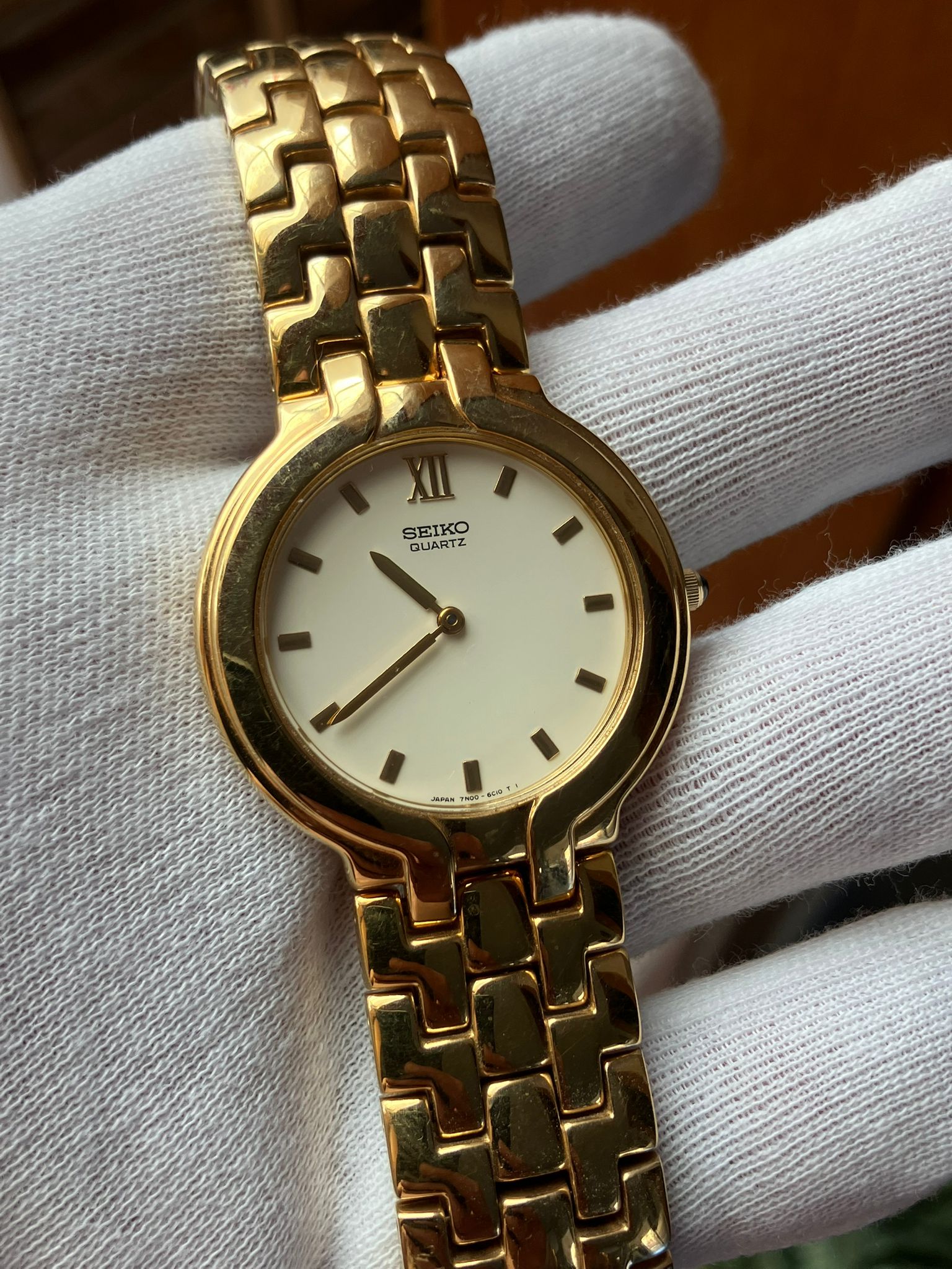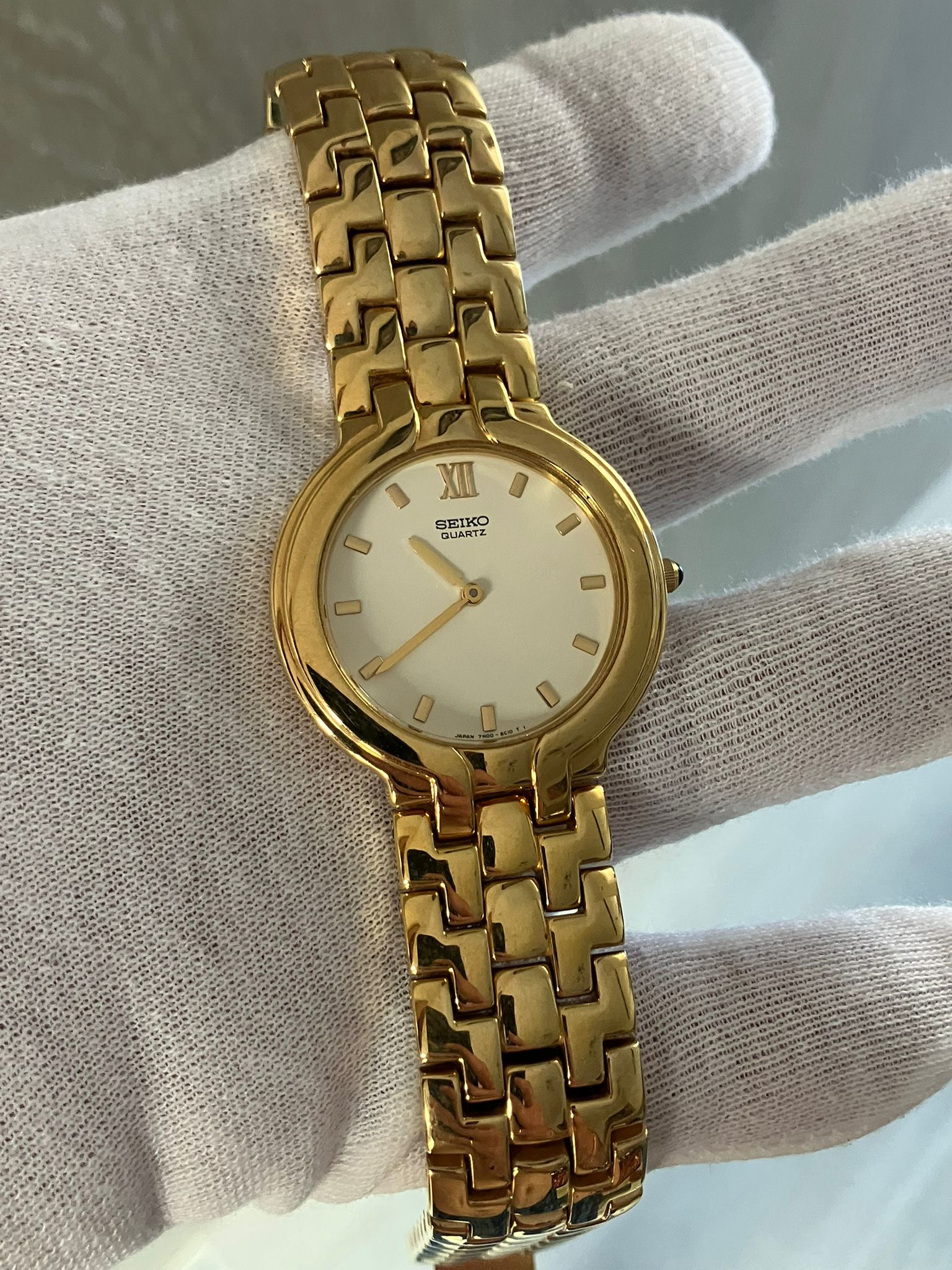 Reloj Seiko de hombre, baño de oro, de antiguo stock de relojería sin uso. Esfera color crema, muy elegante. Mide 33,50 mm sin contar corona.